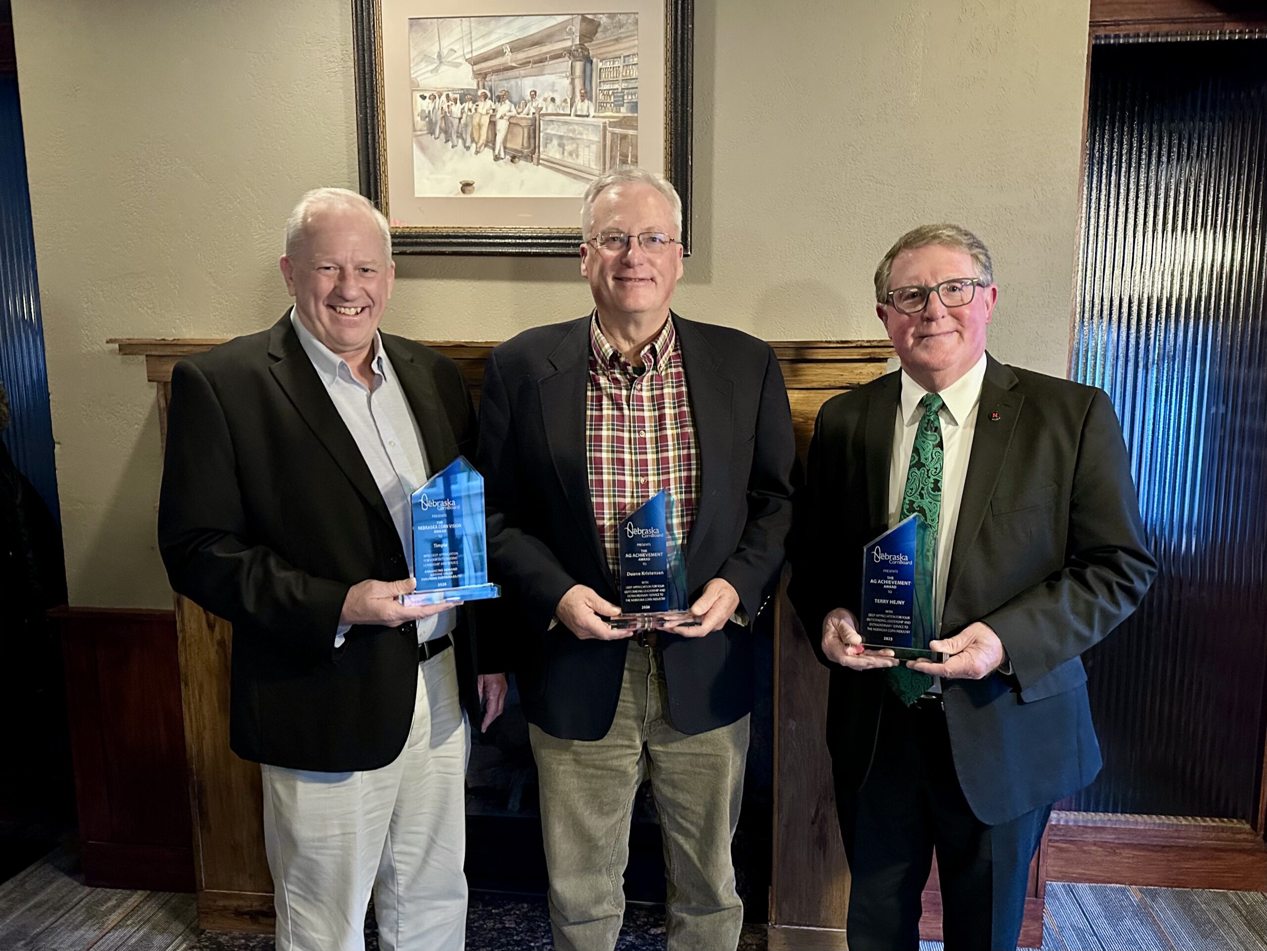 Recipients for the Nebraska Corn Board’s annual awards include Allen Meyer representing Timpte, Inc. for the Ag Vision Award, Duane Kristensen for the Ag Achievement Award and Dr. Terry Hejny, an Ag Achievement Award recipient.